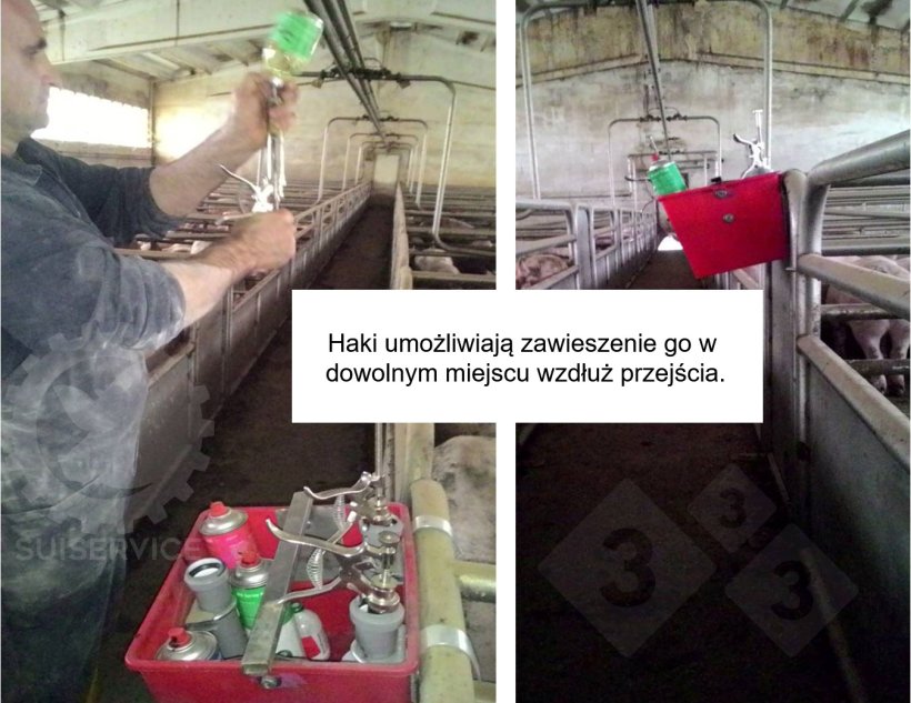 Do wiadra przymocowane są za pomocą zacisków trzy plastikowe rurki, które służą jako przegródki na trzy różne strzykawki, które mogą być używane do różnych zabiegów antybiotykowych lub przeciwzapalnych. Długość rurki jest obliczana zgodnie z długością strzykawki, łącznie z igłą, tak aby po umieszczeniu jej w środku igła nie dotykała dna i nie uległa uszkodzeniu, chociaż zawsze najlepiej jest wyjmować igłę po każdym zabiegu. Zewnętrzne haczyki umożliwiają zawieszenie go na przegrodach kojca na wygodnej wysokości.