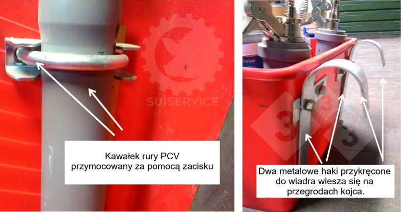 W gospodarstwach rolnych czasami spotyka się prowizoryczne i nieodpowiednie pojemniki, ale ten, który tutaj przedstawiamy, jest bardzo prosty i funkcjonalny oraz wykonany z materiałów powszechnie występujących w gospodarstwie: prostokątnego plastikowego wiadra, plastikowych rur, zacisków i metalowych haczyków.
