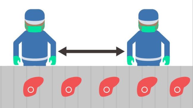 Jest to norma od wielu dziesięcioleci i odzwierciedla rozwiązanie problemu dużych obrotów w zatrudnieniu, na które często cierpią takie duże zakłady produkcyjne. Podczas gdy w niektórych częściach UE, zwłaszcza w małych zakładach, jest to mniej widoczne, jest to bardzo typowe w Stanach Zjednoczonych. Dzięki temu, że pojedyncza osoba wykonuje względnie proste zadania, zakład może łatwo zastąpić pracownika, który odchodzi lub jest chory, szybko i przy minimalnym przeszkoleniu umiejętności. Chociaż jest to dobre rozwiązanie problemu rotacji pracowników, blokuje ono zdolność pracowników zakładu do utrzymania zalecanych odstępów w celu zminimalizowania ryzyka zarażenia. Dlatego ponowne otwarcie zakładów, które doświadczyły wielu zachorowań (ponad 350 pracowników COVID-19 dodatnich w dużej rzeźni w USA) oznacza tworzenie barier z pleksiglasu i dystansowanie pracowników linii w sposób, który powoduje znaczne spowolnienie wydajności zakładu.