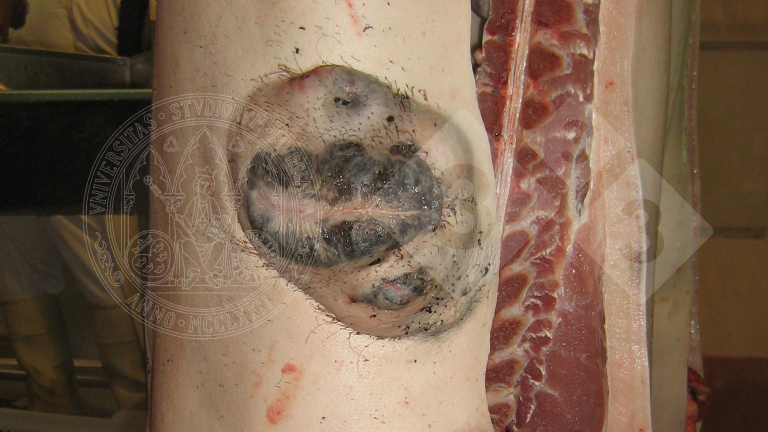 Na ciele tej ubitej świni widać wypukły obszar, z przestrzeniami o czarnym zabarwieniu. Na poziomie mikroskopowym widoczne są grupy komórek z brązowawo-czarnym pigmentem, które ulegają przebarwieniu po zastosowaniu nadtlenku wodoru. Jest to czerniak.