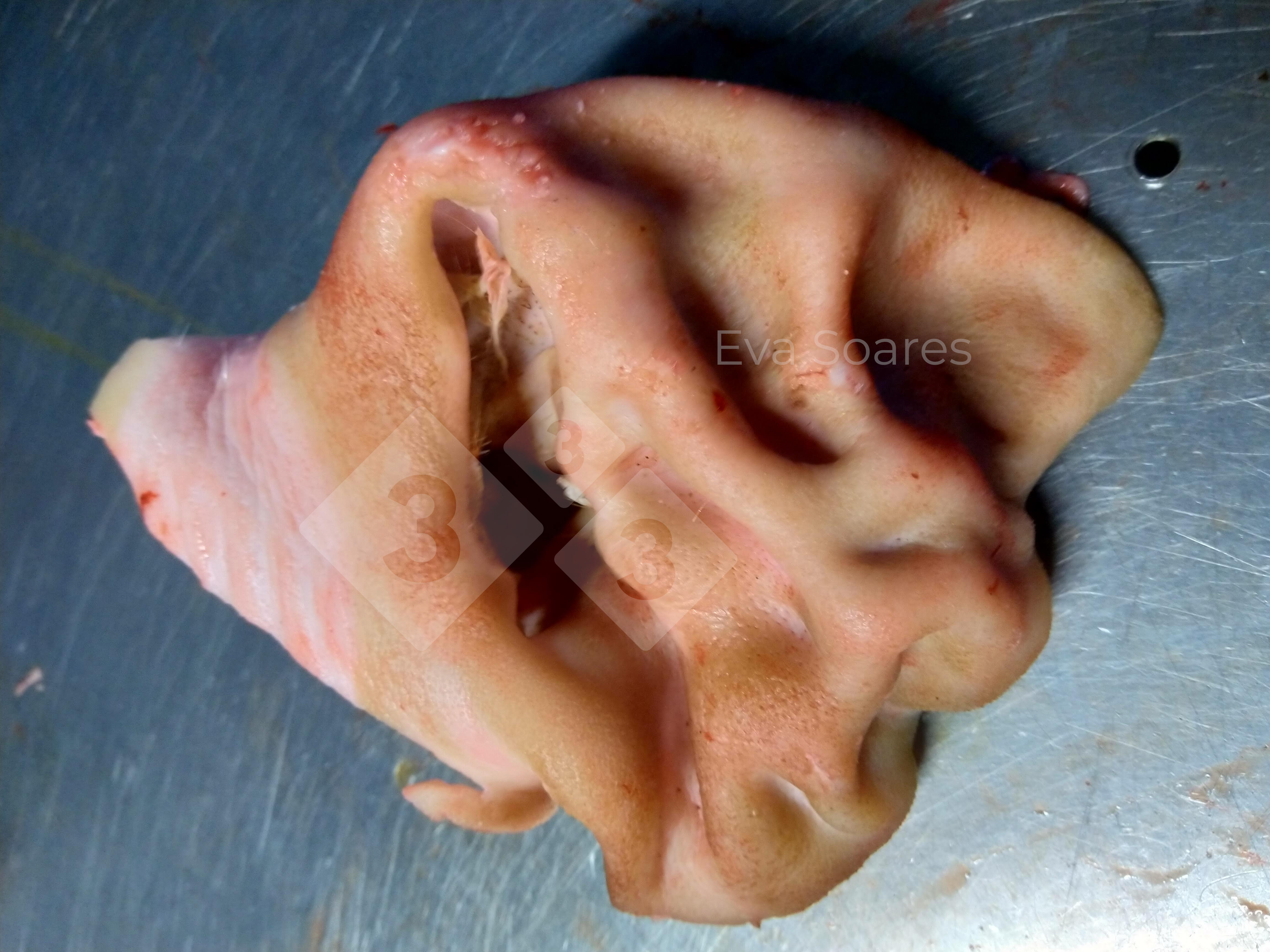 Ucho jest zdeformowane z powodu krwiaka. Zmianę zaobserwowano u tucznika w rzeźni. Krwiaki uszu są konsekwencją urazów wynikających zgryzienia uszu, gwałtownego potrząsania głową z powodu intensywnego świądu (np. świerzb) lub dlatego, że świnie były łapane za uszy.