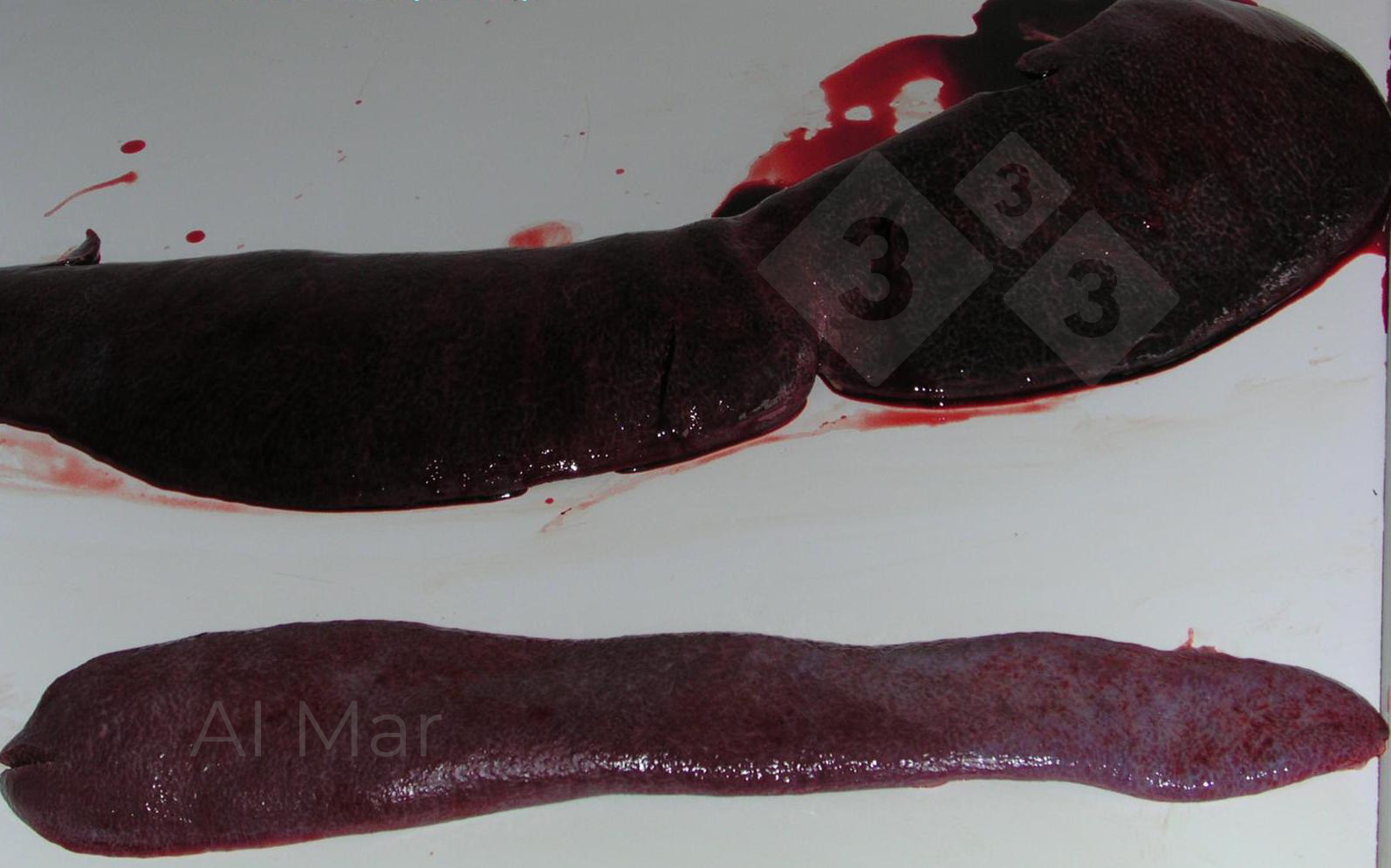 Na zdjęciu pokazano normalną śledzionę obok patologicznie powiększonej, która ponadto ma znacznie ciemniejszą barwę i większą kruchość (czyli mała odporność na ciśnienie).
