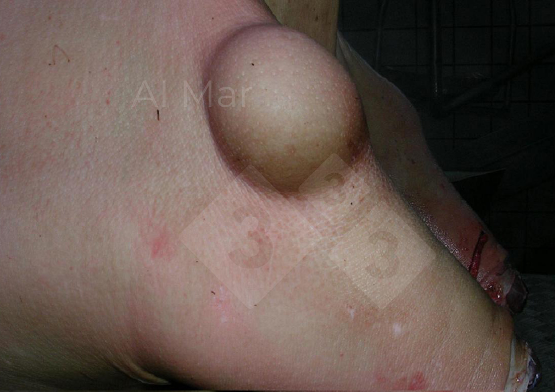 Surowicze zapalenie stawów w tym przypadku dotyczy stawu łokciowego. Po wykonaniu cięcia powstałej zmiany wypłynęła ciągnąca się, przezroczysta ciecz -niezmieniona maź stawowa.