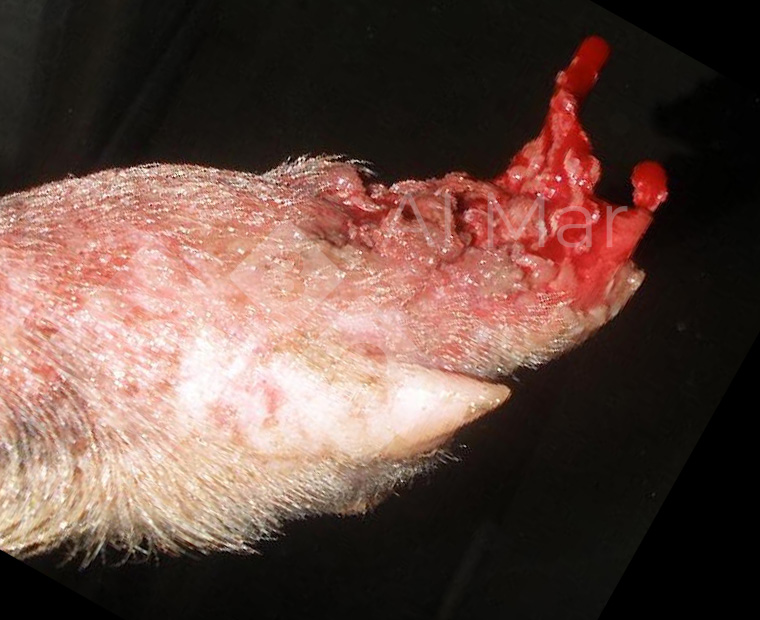 Widoczne uszkodzenie to zranienie w dalszej części na kończyny przedniej u świni z odchowalni. Najbardziej prawdopodobną przyczyną jest zły stan rusztu, co spowodowało uraz w obrębie racicy, z krwawieniem i pęknięciem ściany racicy. Właściwa konserwacja pomieszczeń zapobiega tego rodzaju problemom, które powodują cierpienie u zwierząt i mogą być początkiem poważniejszych schorzeń.
