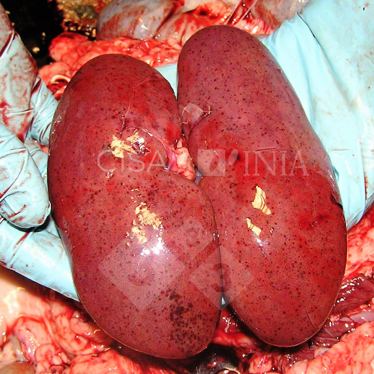 Podostry obraz kliniczny ASF 21 dni po zakażeniu eksperymentalnym. Zwierzę wykazywało gorączkę przez 1 tydzień (> 40,5), anoreksję i zalegało. W sekcji zwłok stwierdzono wybroczyny w korze nerki.