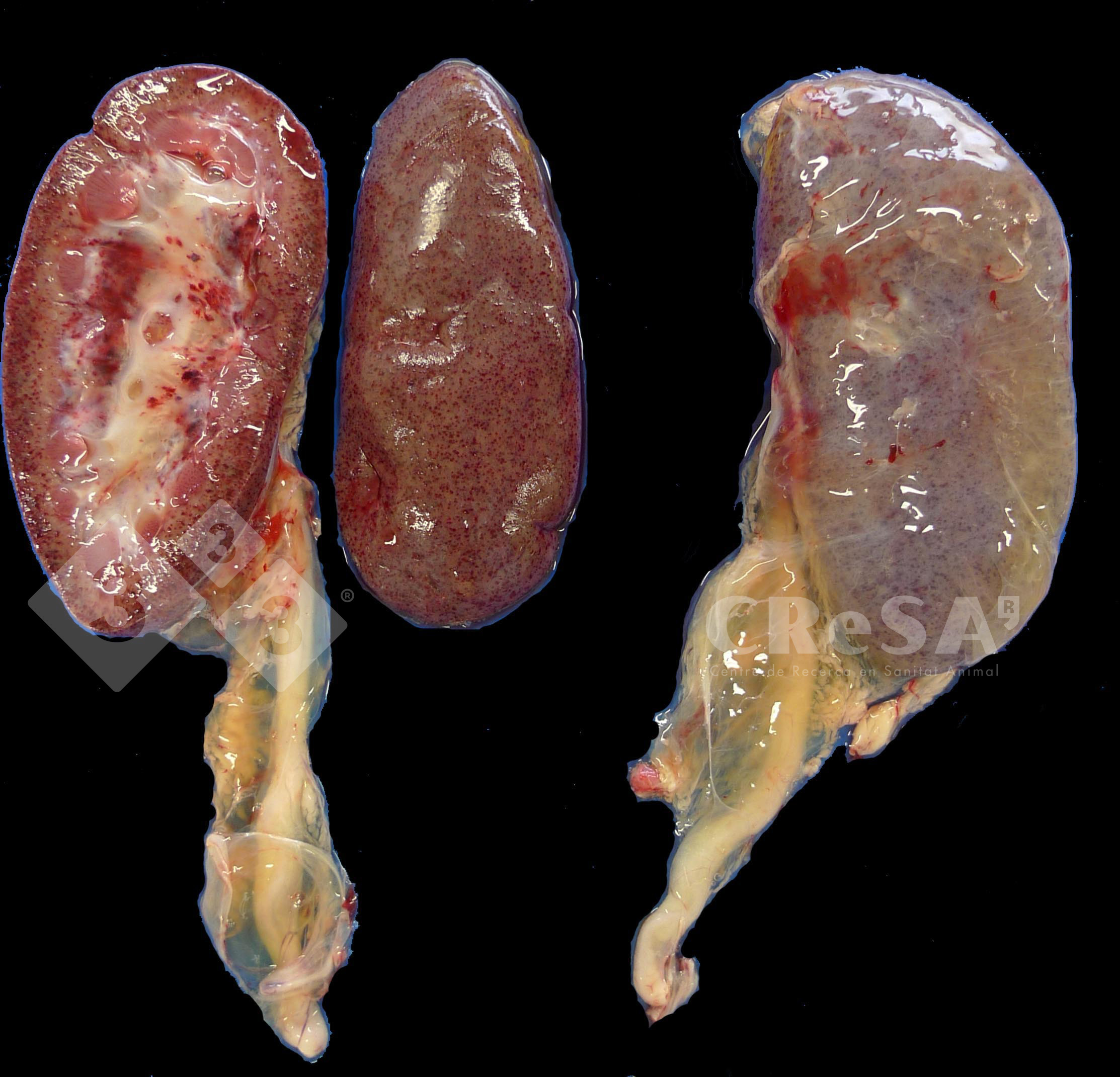 Wirus afrykańskiego pomoru świń (ASF) powoduje między innymi powstanie obrzęku okołonerkowego i różne rodzaje wylewów krwawych. Na tym zdjęciu widoczne są wybroczyny ( poniżej 3 mm) w korze i miedniczkach. Diagnostyka różnicowa obejmuje niespecyficzną posocznicę i zatrucie antykoagulantami