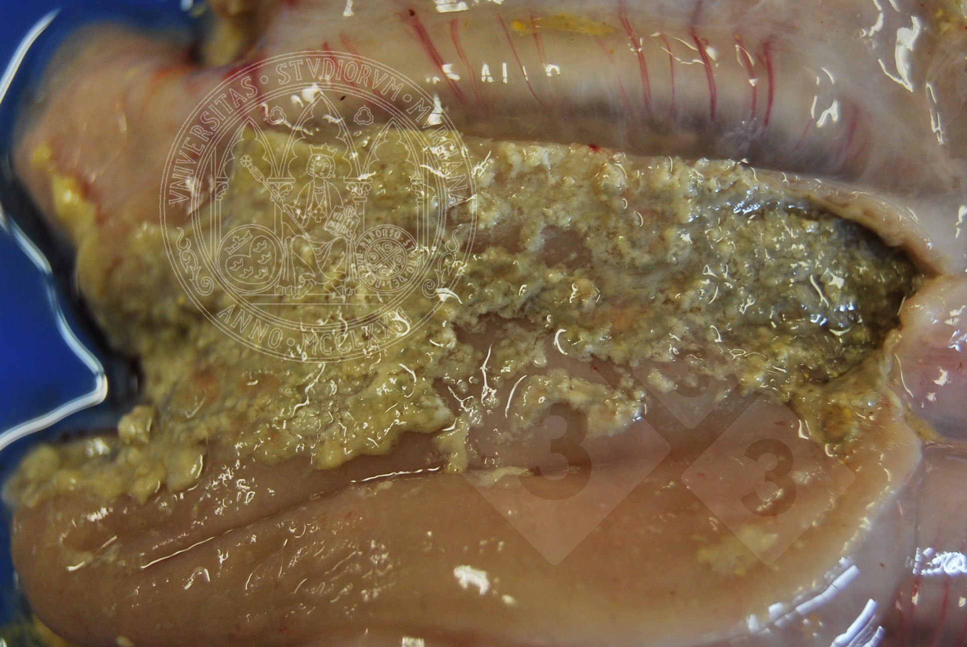 Na zdjęciu widoczna jest okrężnica świni po odsadzeniu, której błona śluzowa ma żółtawo - ziarnisty wygląd, z gładkimi ogniskami uszkodzeń. Na poziomie mikroskopowym są to obszary z martwicą błony śluzowej. Jest to martwicze zapalenie jelita grubego wywołane przez Salmonella. Zakażenie to może również wpływać na jelito cienkie. Należy różnicować ze zmianami wywołanymi przez Brachyspira, szczególnie B. hyodysenteriae, które atakują tylko jelito grube i które są częstsze w okresie tuczu ale niekiedy może dotyczyć prosiąt na odchowalni.