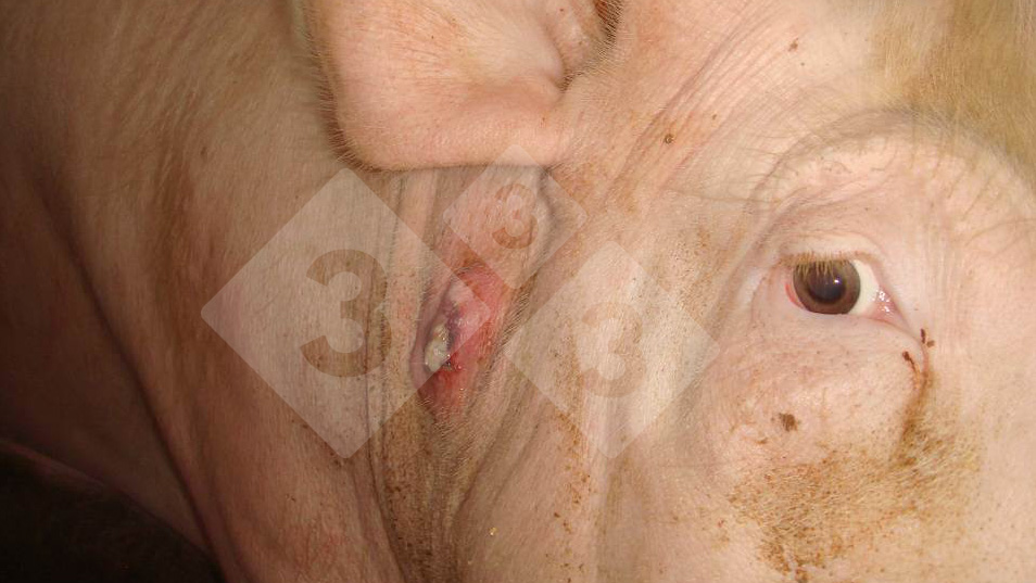 U tej świni wystąpiły typowe oznaki odczynu w miejscu iniekcji i zakażenie, co manifestuje się ziarniniakiem bakteryjnym w skórze. Zazwyczaj takie uszkodzenie ma średnicę 2 do 5 cm, w okolicy skóry szyi. Grudki są bardzo twarde i bolesne przy dotknięciu. U niektórych świń na środku grudki owrzodzenie może mieć ciemniejszy kolor. Jeśli jedna strzykawka i igła jest stosowana u wielu świń, z różnych kojców, jest duże prawdopodobieństwo, że na igle zbiorą się bakterie środowiskowe. Gdy igła jest ponownie użyta u następnej świni, bakterie pochodzące ze środowiska mogą zostać wstrzyknięte bezpośrednio do tkanki zwierzęcia. To może następnie wywołać miejscową reakcję zapalną i wytworzyć widoczną na zdjęciu zmianę.