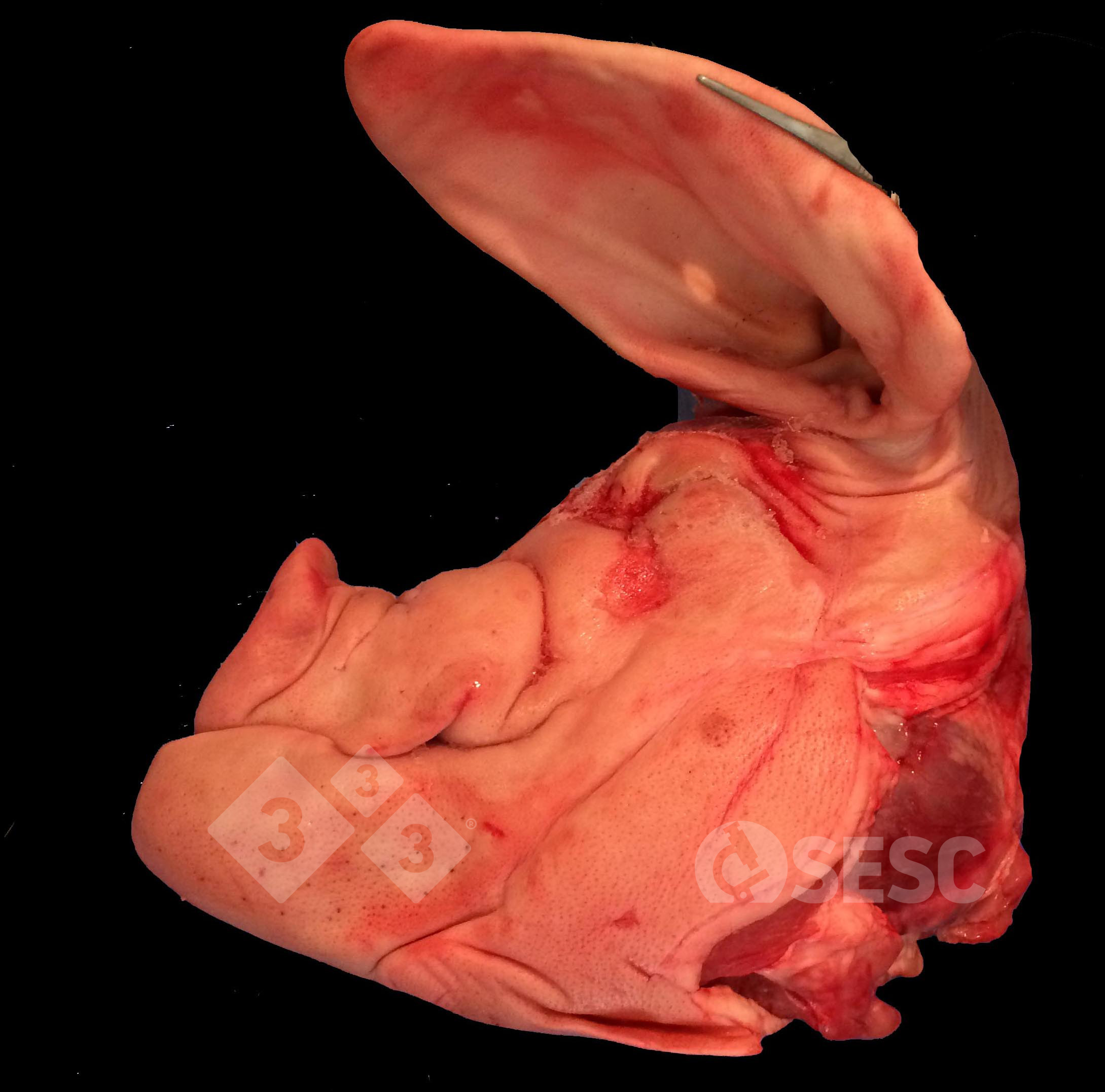 U tej świni można zaobserwować skrócenie kości szczękowej (Brachygnathia superior) wtórnie do atrofii i małżowin nosowych. Choroba ta nazywana jest zakaźnym zanikowym zapaleniem nosa, jest to wieloczynnikowa choroba wywołana przez szczepy dermonekrotoksyczne Pasteurella multocida (postępujące zanikowe zapalenie nosa) i Bordetella bronchiseptica (niepostępujące zanikowe zapalenie nosa) Zła jakość powietrza jest czynnikiem predysponującym.